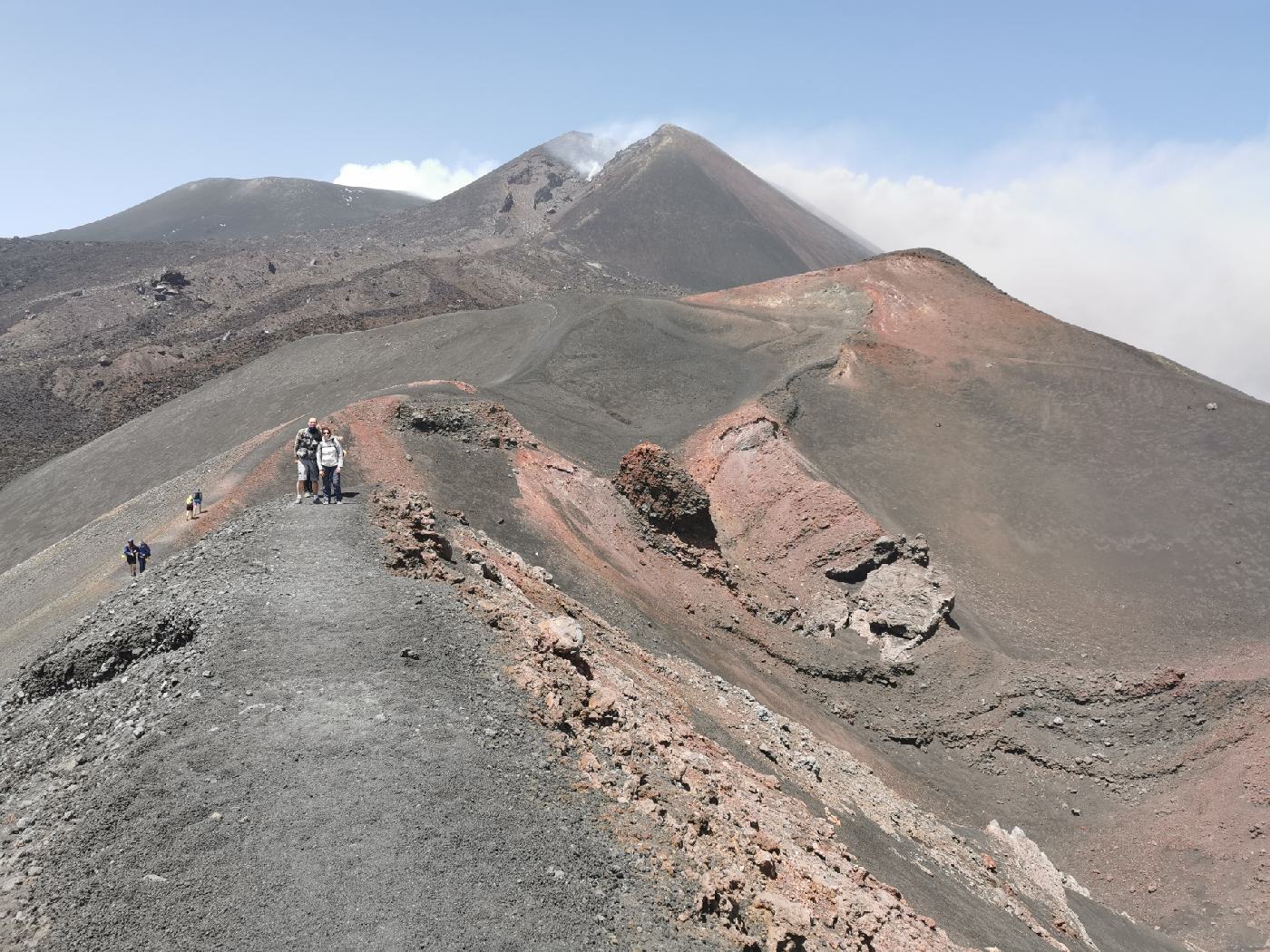Nous partons après le petit déjeuné (6h), en passant par le centre de l’ile. Après nous avoir laisser un peu dormir, la guide nous raconte l’histoire, la géographie et milles anecdotes sur la Sicile, pendant que l’on approche petit à petit de Catane puis de l’Etna. en cours d’ascension, on apprend que l’Etna, ce n’est pas un mais un massif de Volcans ! Et qu’il est toujours très actif, d’ailleurs la route un peu avant le départ du téléphérique a été refaite il y a quelque année, car elle a été enseveli sous une coulée de lave, comme en témoigne une maison ensevelie à mis parcours. Le téléphérique et la station de ski aussi en 2004.