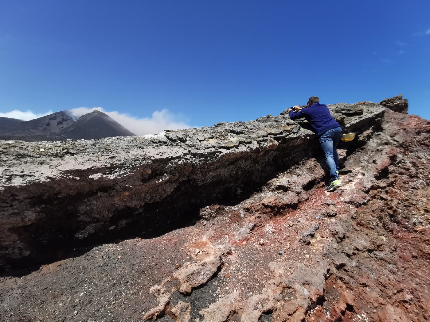 Nous montons lentement vers un cratère secondaire du début des années 2000, en observant les milles nuances de formes et de couleurs des roches, les reste de bombes, les coulées et les éboulis. Le sol est chaud, avec des sortie de vapeur d’eau par endroit.