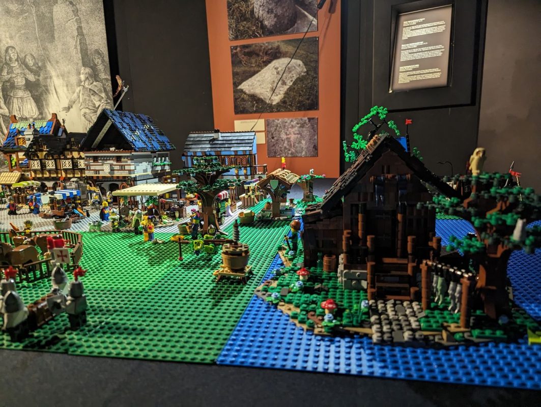 Parti après le travail et après avoir roulé sous des trombes d’eau, j’arrive à l’abbaye le dernier, accueillis par Guénolé, l’initiateur de ces événement LEGO du musée, et par un joli arc en ciel ! Je sais maintenant que l’installation vas vite, donc j’en profite pour essayer une petite modification. Je trouve que le château n’est pas assez haut par rapport aux maisons, donc je fais l’essaie d’en mettre une des deux parties en haut de la montagne, à la place de l’église. J’ai pris des plaques et un petit assortiment de pièces pour pouvoir agrandir un peu le dio d’une plaque de 32. Après quelques essais, c’est adopté, l’église et la forêt prenne place en basse ville, et j’agrandis la mer, avec un trou en prévision de mettre le village Viking que je vais essayer de faire un peu le soir et sur place. Je finirais demain matin, le musée ouvre à 10h30 donc j’ai 1h30 pour finir. Repas (merci Laurence pour toute la logistique/cuisine du week-end), longue discussion et nuit dans un gite un peu plus loin dans le village.